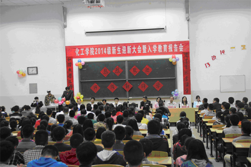 典礼在雄伟的国歌声中拉开了序幕。首先由学院院长高楼军教授致迎新辞,代表学院党政以及全体师生向2014级新生表示了衷心的祝贺和热烈的欢迎,并介绍了学院的总体情况和师资、教学科研、实验等的特色和优势。副院长王记江博士详细介绍了化工学院的历史沿革和学科优势,他希望2014级新生珍惜进入大学深造的机会,迎接新挑战、力争创造新成绩。副院长张玉琦博士后对研究生专业做了系统的介绍,她鼓励新生在大学中超越自我,更进一步。教师代表陈小利教授结合个人经历与同学们在学习生活等方面做了真诚的交流。2012级过控班柳文文同学代表高年级同学发言,他把自己几年来在学校的生活经验,化作朴实的建议给新生:“在踏实学习的同时也要积极参加实践活动,提升自身的综合能力”。2014级新生代表姚赛同学代表全体新生发言,她表达了对延安大学和化工学院的向往与憧憬,立志成才。