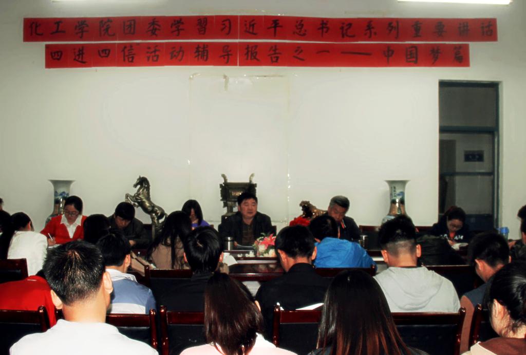 2015年3月31日,化工学院团委在学院会议室组织召开了道德讲堂第三季度的活动——中国梦篇,邀请院党委书记舒永安为学院师生骨干做了题为《中国梦——全体中华儿女的共同向往与追求》的辅导报告。学院教工及学生党支部书记、全体辅导员、班主任、各班团支书、院团委学生会骨干和优秀党员代表参加了报告会。报告会由院党委秘书申圆圆主持。