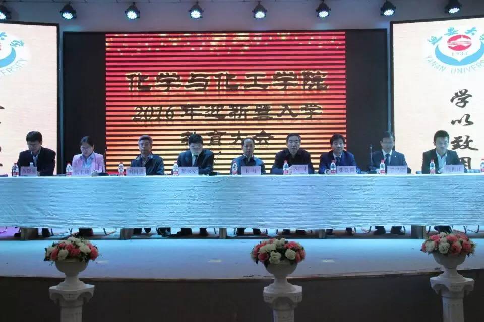 朗金秋,丹桂飘香。9月14日上午,化工学院2016级新生开学典礼暨入学教育大会在大学生活动中心隆重举行。优秀教师代表齐广才教授,教务处处长付峰博士,院党委书记舒永安,院长张琰图博士,院党委副书记刘雨录,副院长王记江博士、张玉琦博士,科研秘书高晓明等出席大会。研究生秘书柴红梅副教授,教学秘书孙雪花副教授,行政秘书张旭方,辅导员徐菁、苏清元,新生班主任董超云,校研究生会主席王浩,学院学生会主席闫振江及本科和硕士新生参加了大会。本次大会由团委书记韩盟主持。