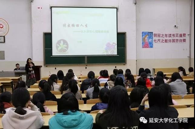 为了庆祝3月7日女生节的到来,2017年3月6日7:00化工学院邀请到英国威廉集团官网教育科学学院心理学博士,延安大学心理咨询中心主任石梅老师在第五阶梯教室为16、17级全体女生作了“绣出绚丽人生”专题讲座,本次专题活动由董垚主持。
