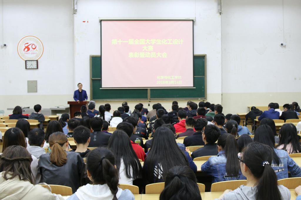 为了表彰在第十一届全国大学生化工设计竞赛中取得优异成绩的参赛选手,鼓励更多化工学子参加化工设计竞赛,提高同学们的创新能力及综合素质,2018年3月14日16:30化学与化工学院在玉章楼第五阶梯教室举办第十一届全国大学生化工设计大赛表彰暨动员大会。参加本次大会的有延安大学教务处副处长薛皓、学院领导、教学、学生管理人员、化工教研室全体老师以及15、16级化工班、能化班和2017化工玉章卓越班共234名学生。本次大会由化学与化工学院教学副院长王记江主持。