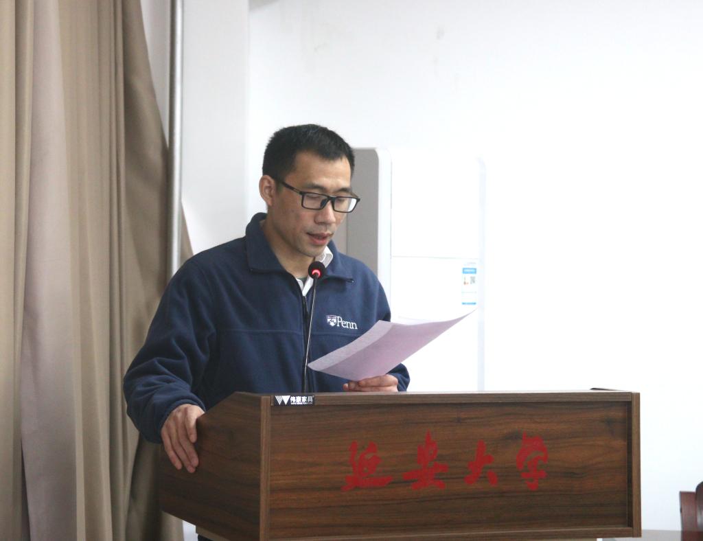 最后,武忠远教授作了讲话。他首先感谢武汉工程大学对延安大学学科建设的长期关注和实质性支持,同时要求两位新任博导认真学习领会武汉工程大学有关研究生培养教育的规定,潜心科学研究,努力培养高质量的博士生,着力促进英国威廉集团官网博士点的申报工作。