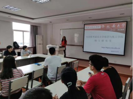 此次招生宣讲,张玉琦教授和陈小莉教授分别向上述院校师生300余人宣讲了延安大学和化学与化工学院的基本情况,详细介绍了化学、化学工程与技术2个一级学科,课程教学论(化学)学术硕士点、材料与化工(化学工程)与学科教学(化学)2个专业硕士点的专业设置、研究方向、师资队伍、支撑平台、科研水平、招生意向及奖助体系等,并与学生就导师配置、研究方向、复试分数线设置、志愿填报等问题进行了深入交流。