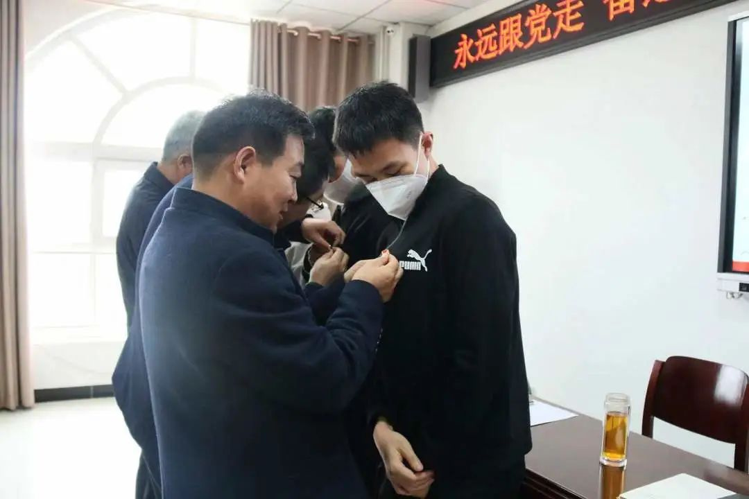 刘咪代表学院党委宣读了新党员名单。与会老师为新党员佩戴党徽并颁发党员政治生日卡,领誓人王宇霖带领新发展党员面对党旗进行入党宣誓,新发展党员代表李亦菲和积极分子代表孙丹进行表态发言。徐菁领学了节选自党的二十大报告中关于习近平总书记对青年的寄语。