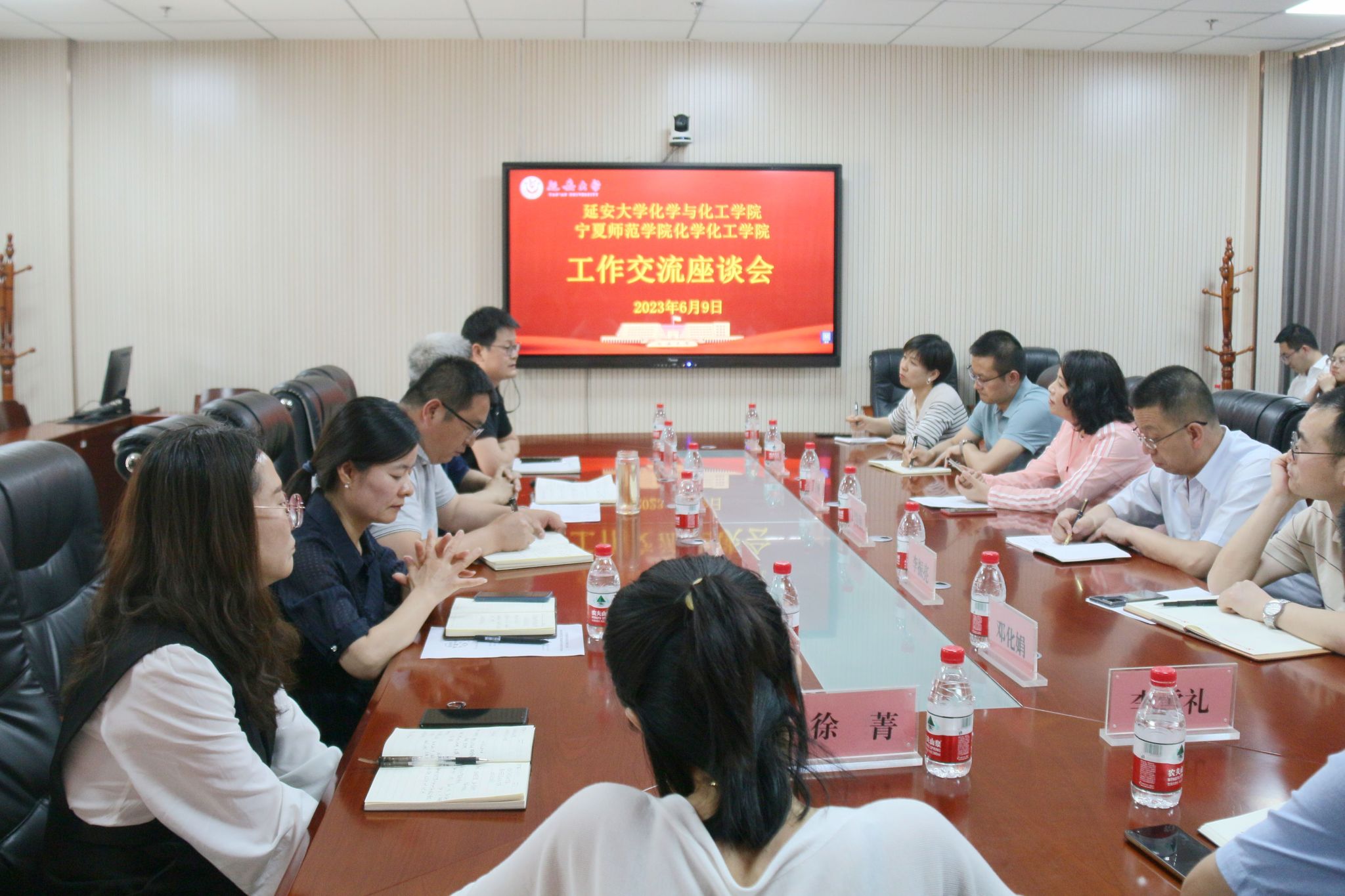 座谈会上,刘雨录书记首先对丁吉娅书记一行来访表示热烈欢迎,并从学院党委组织构成、党建品牌建设、党建与业务融合、延安精神和一体两翼育人体系、党建成果等方面进行介绍。王潇、高晓明副院长分别从学院办学历史、专业建设、学科建设、人才队伍、科研平台建设等方面介绍了学院基本情况。丁吉娅书记简要介绍了宁师化工学院基本概况、师资队伍、党建工作取得的成绩和存在的问题。随后,与会老师围绕学院党建品牌建设、毕业生就业工作、本科生实习、硕士生培养、硕士生导师实验室管理方面进行深入交流。