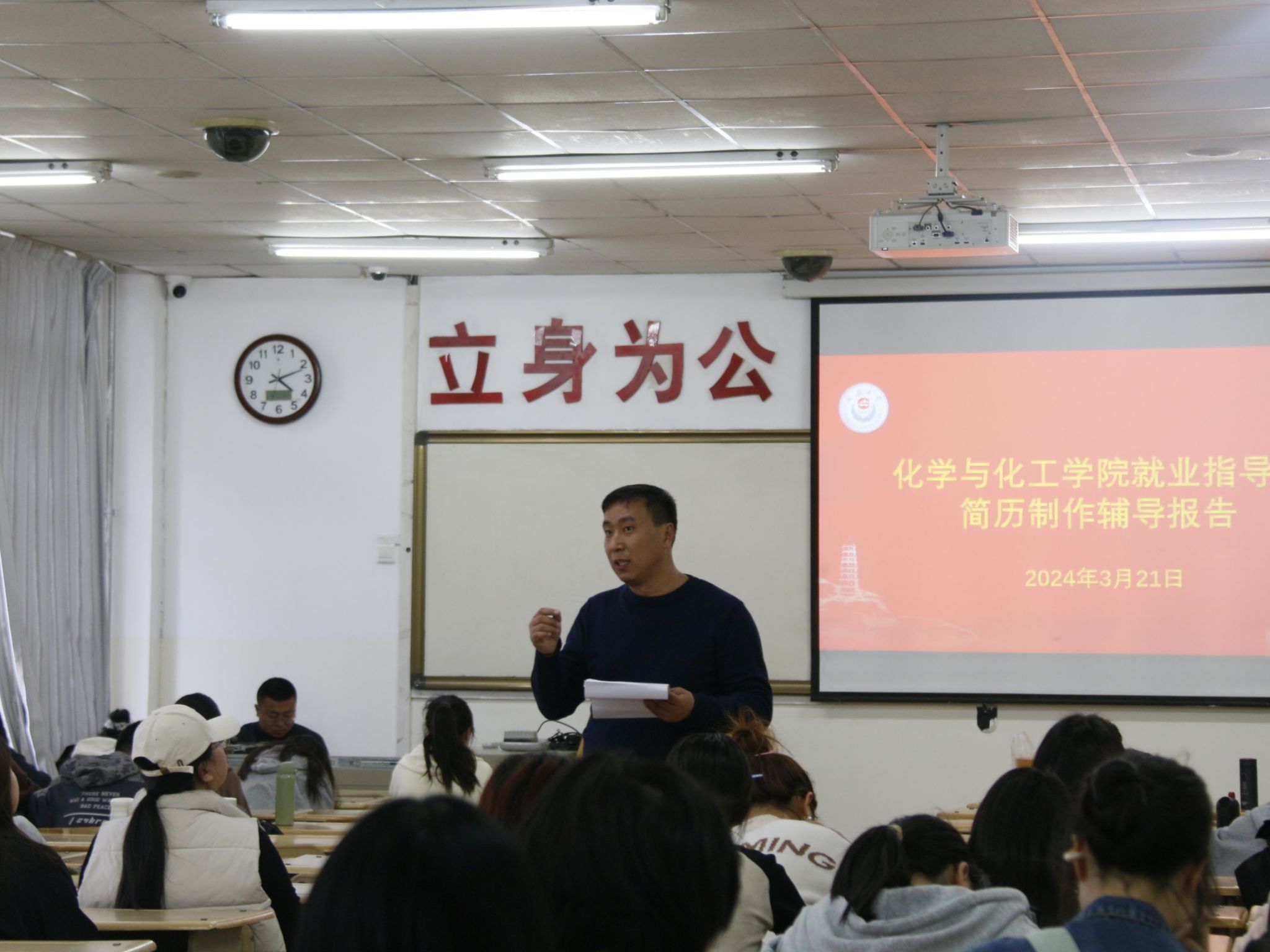 3月21日下午,化工学院在周扬楼504教室举办2025届毕业生就业指导暨简历制作辅导报告。2021级140余名学生参加了报告会,中公教育资深面试讲师黄开满老师作了《大学毕业生简历制作与修改》报告,报告会由辅导员苏清元主持。