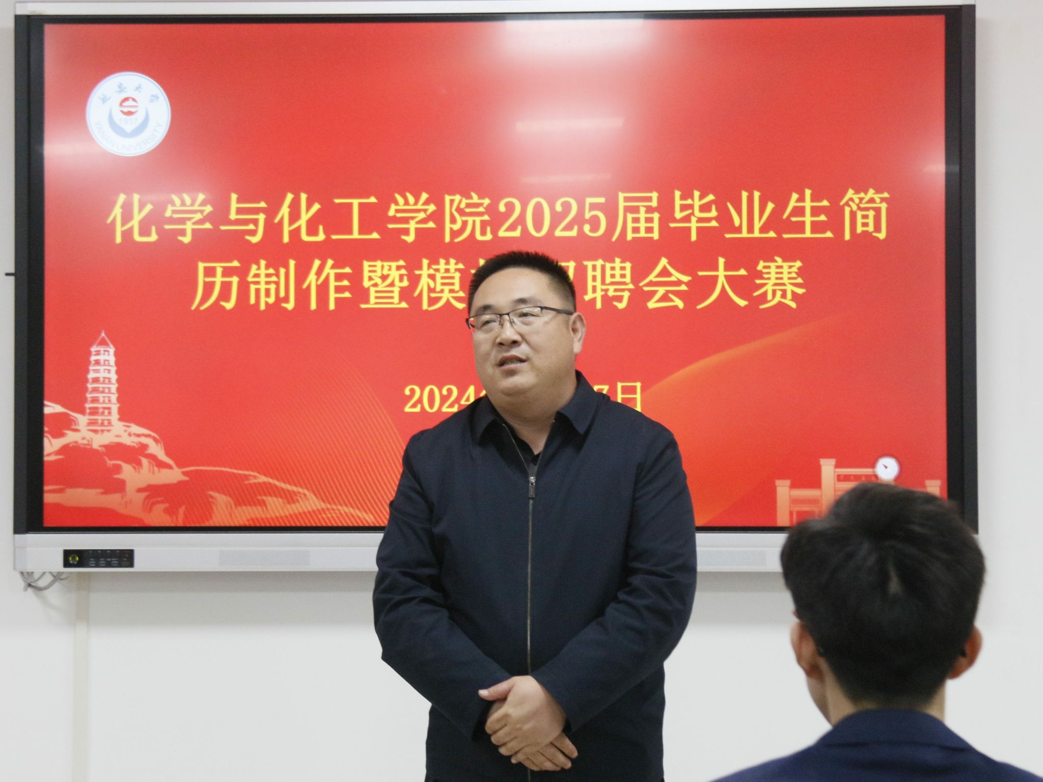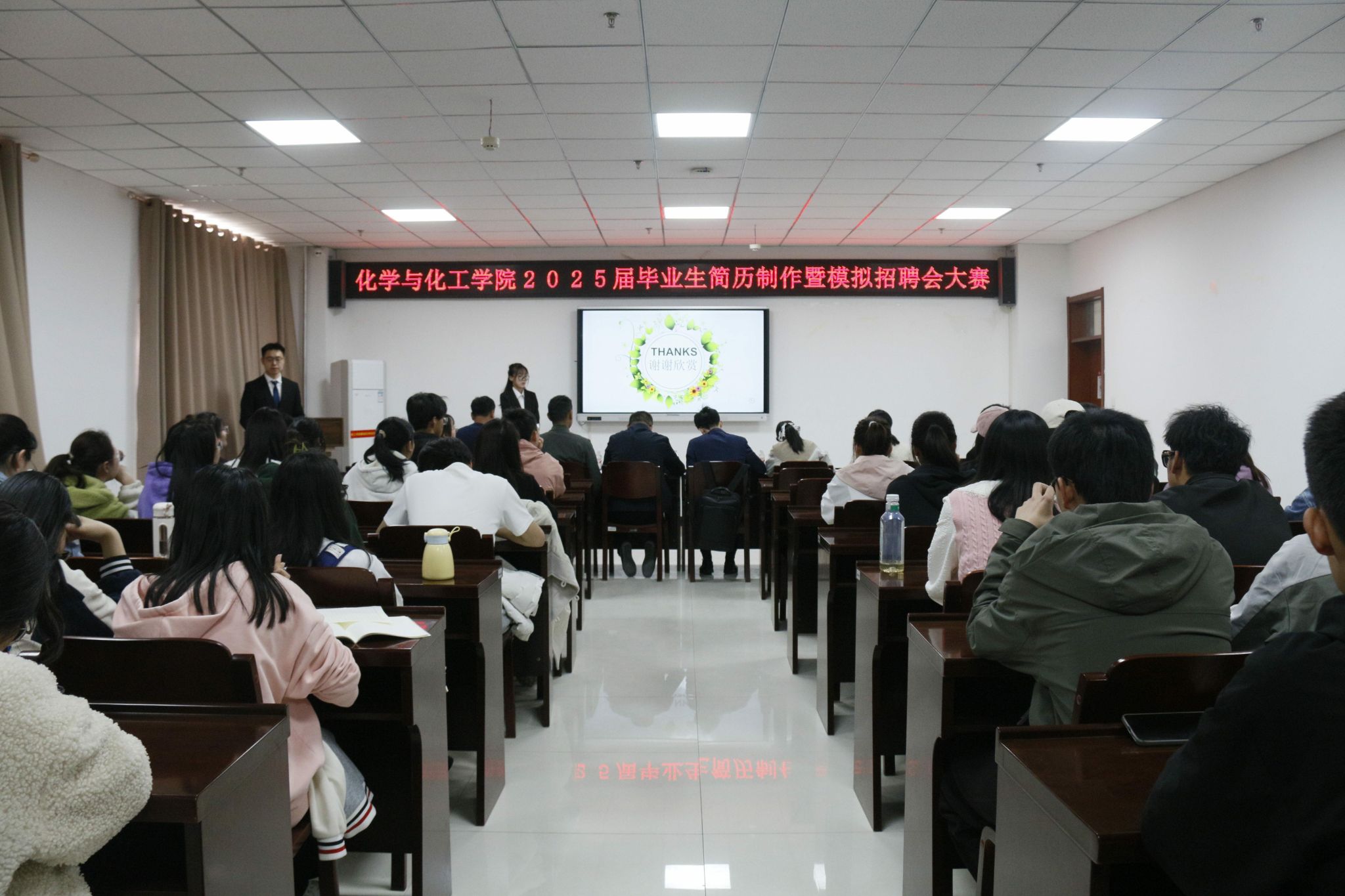 3月27日下午,化学与化工学院在化工大楼216会议室举办2025届毕业生简历制作暨模拟招聘大赛。院党委副书记赵芝瑞,中公教育资深面试讲师余昌春、辅导员徐菁、苏清元、张哲豪、刘咪参加比赛并担任评委,2021级80余名学生现场观摩比赛。