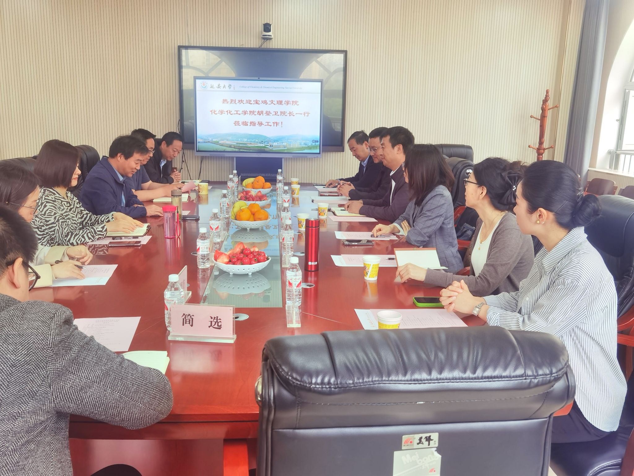 张琰图院长对胡登卫院长一行来院考察交流表示衷心欢迎。并简要介绍了延安大学和化学与化工学院的办学历史、发展现状、师资队伍建设、本科教学、学科建设、硕士生培养等方面情况;胡登卫院长从宝鸡文理学院和化学化工学院的办学历史和发展规划以及师资队伍、人才培养、学科建设、科学研究、专业建设等方面的情况做了详细介绍。随后双方围绕教育教学、地区基金、联合进行校企合作、师资队伍建设、就业升学、党的建设、学生工作等方面进行深入学习交流。并现场参观考察了学院的本科教学和科研实验室。