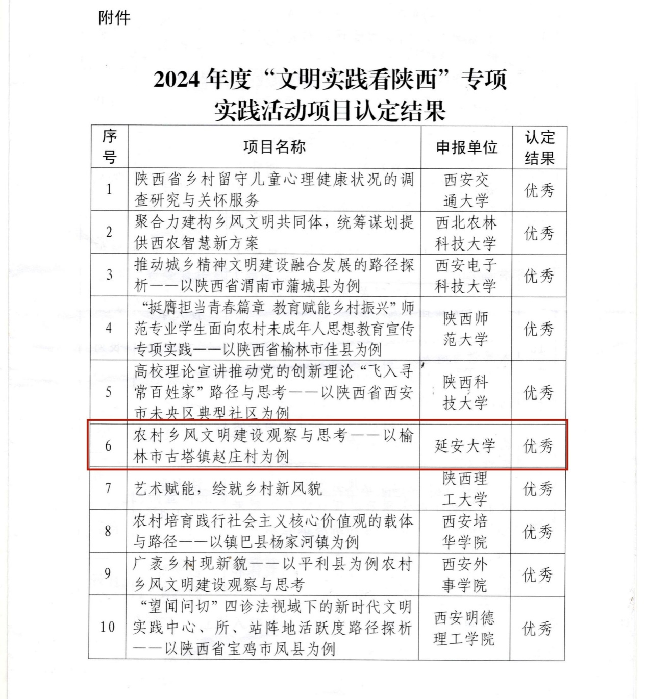 近日,中共陕西省委精神文明建设办公室公布了2024年度“文明实践看陕西”专项实践活动评审结果,由我院李皓瑜、徐菁老师带队,王嘉慧(应化22)、黑梦楚(化工22)、等7名学生组成的“乡韵振兴”实践队所申报的“农村乡风文明建设观察与思考-以榆林市古塔镇赵庄村为例”项目荣获2024年度“文明实践看陕西”专项实践活动优秀项目。