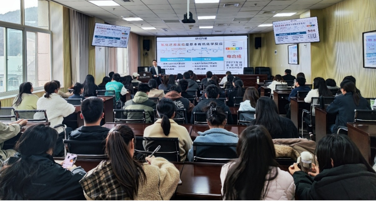 报告会上,梅天胜研究员围绕“电极调控金属价态−金属调控反应选择性”的研究理念,融合电化学和金属有机催化,详细讲解了其在过渡金属作为分子电催化剂的间接电解策略在碳氢键、碳卤键转化以及不对成合成方面的工作。报告会结束后,梅天胜研究员与参会师生进行了深入、细致的交流和讨论。