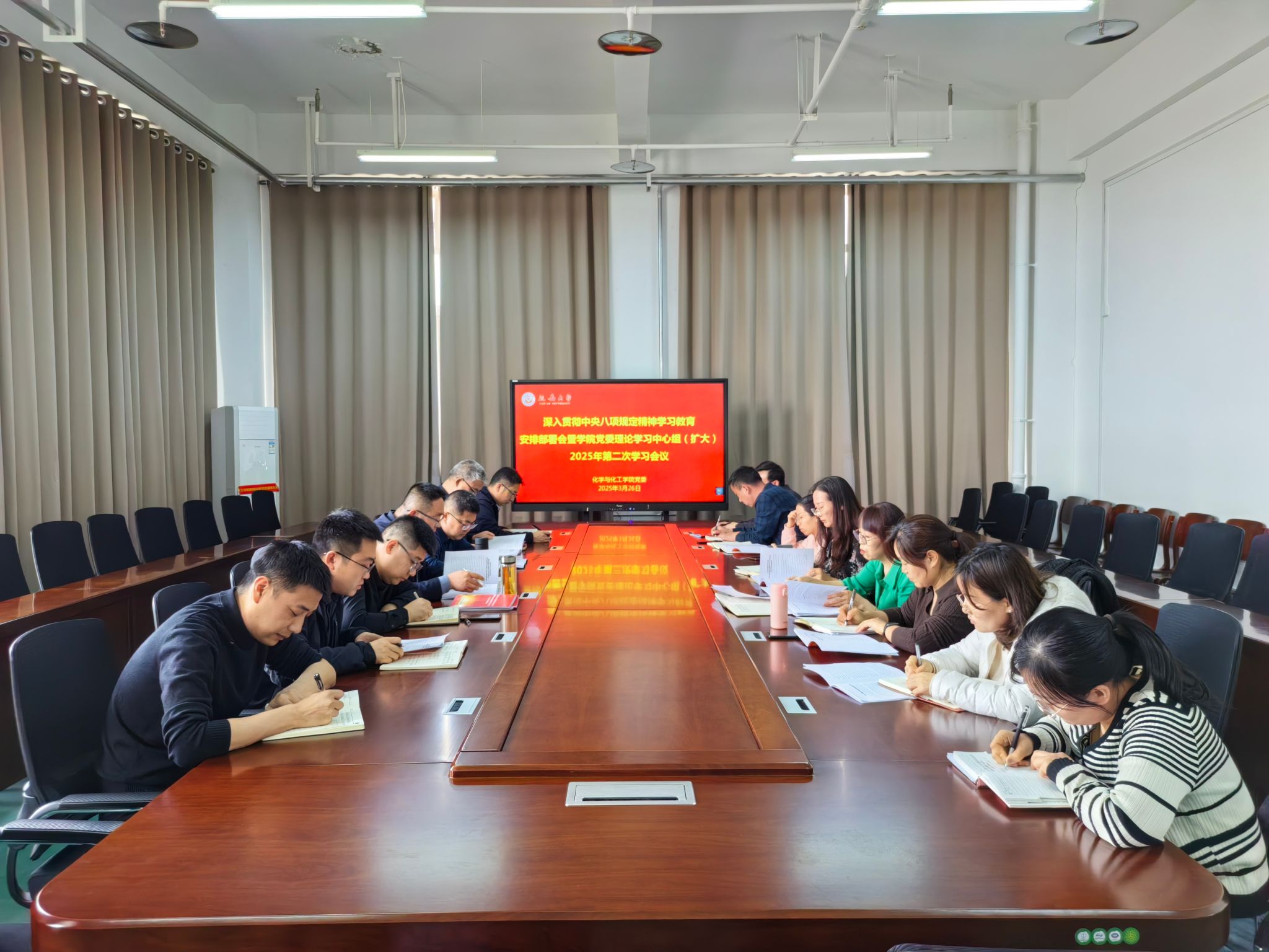 3月26日下午,化工学院在学院1019会议室召开深入贯彻中央八项规定精神学习教育部署暨党委理论学习中心组(扩大)2025年第二次学习会议。全体院领导、各支部书记、各系主任、副科级以上干部参加会议,会议由学院党委书记赵芝瑞主持。