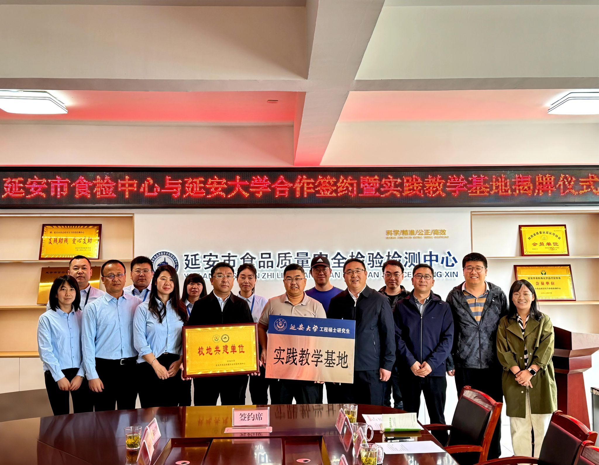 2025 年 5 月 13 日上午,我院与延安市食品质量安全检验检测中心在食检中心举行了签约、校地合作揭牌暨工程硕士实习会议。学院全体领导班子、实习带队教师、材料与化工工程硕士专业实习学生和市食检中心全体干部参加了会议。会议由食检中心党支部书记、副主任王琳主持。