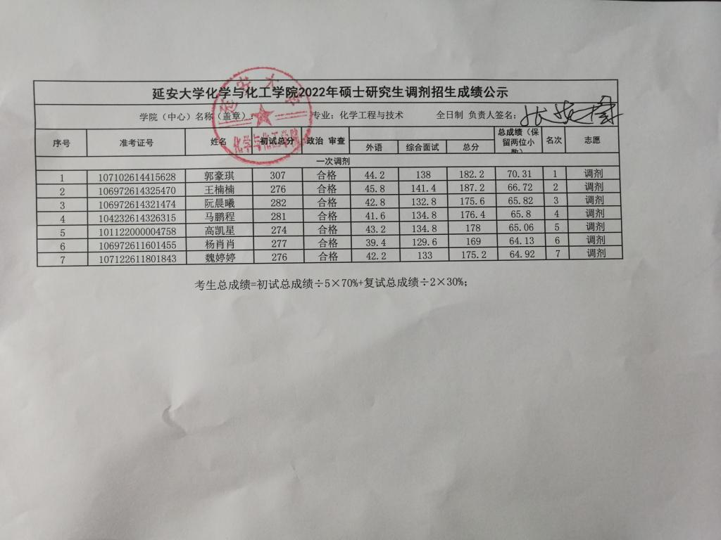 根据考生总成绩计算公式(考生总成绩=初试总成绩÷5×70%+复试总成绩÷2×30%),现予以公示我院各专业调剂招生成绩,如有异议请以书面形式报至我院。