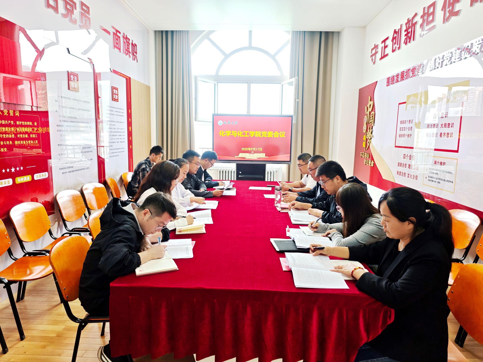 9月17日下午,化工学院在党员活动室召开党委扩大会议,专题学习习近平总书记关于深入贯彻中央八项规定精神学习教育的重要指示精神,传达中央、省委、教育部党组、省委教育工委及学校党委关于巩固拓展学习教育成果、推动常态长效的工作要求,全面总结学院贯彻落实中央八项规定精神工作成效,并对下一阶段重点任务进行部署。学院党委委员、各师生党支部书记、副科级以上领导干部参加会议。会议由学院党委书记赵芝瑞主持。