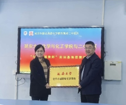 4月8日,学院与延安市宝塔区第二中学在宝塔区第二中学举行“化学卓越教师实训基地”授牌仪式。宝塔区第二中学副校长张娟,教务科封芳芳、纪珍珍,化学教研室高孝孝,薛盼;学院院长甄延忠、副院长简选,化学与应化系主任陈小莉,化学系主任崔华莉,化学系副主任高娇娇等共同出席。仪式由宝塔区第二中学副校长陈国宝主持。此次合作旨在深化协同育人机制,贯通化学专业师范生职前职后培养体系,为基础教育高质量发展培养具有延安精神特质的中学化学骨干教师。